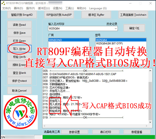 3)RT809F编程器自动转换,直接写入CAP格式BIOS成功
